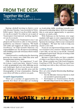 As we begin a new Toastmasters year, I am generations. Consider becoming a Club